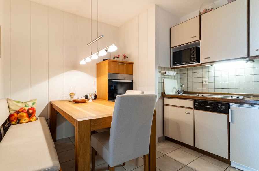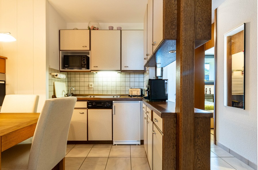 Die gut ausgestattete Küche beinhaltet auch Kaffeemaschine, Senseomaschine, Toaster, Mikrowelle, Backofen sowie Geschirrspülmaschine. Einen Hochstuhl für die Kleinen findet ihr im Abstellraum.